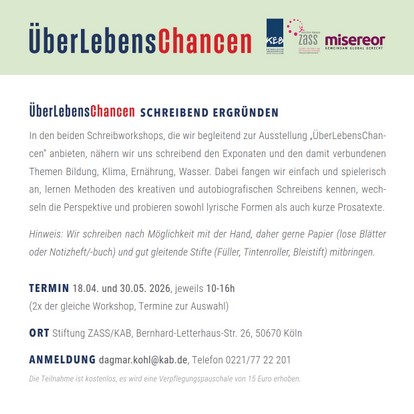 Vom 24. bis 28. November 2025 findet zum Thema „ÜberLebensChancen“ im Heinrich Lübke Haus in Günne am Möhnesee ein kreatives Seminar statt, dass sich dieser drängenden Herausforderung widmet. Dies im Kontext der Initiative „ÜberLebenChancen – Für ein besseres Morgen“ des bischöflichen Hilfswerks Misereor, der Katholischen Erwachsenenbildung Deutschland (KEB) und der Stiftung Zukunft der Arbeit und der sozialen Sicherung (ZASS) der KAB, die zum Nachdenken anregen, Fakten, Beobachtungen und Ideen beisteuern und den Blick weiten will, wie ein anderes zukunftsfähiges Leben für alle gelingen kann.